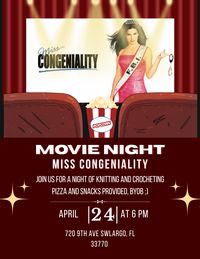 April 24th at 6pm, When a terrorist threatens to bomb the Miss United States pageant, the FBI rushes to find a female agent to go undercover as a contestant. join us for a night of knitting and crochet to watch miss congeniality Movie Night